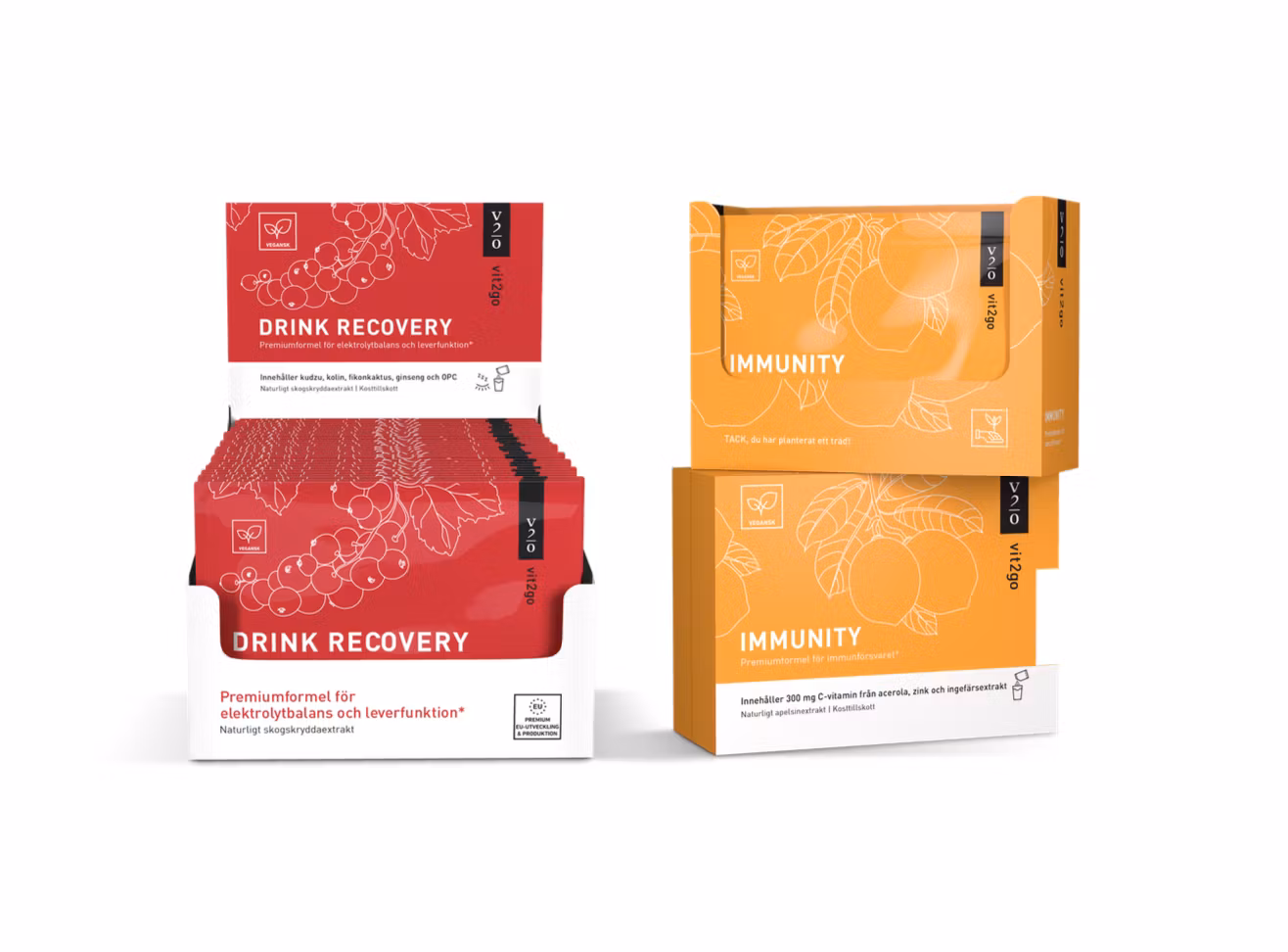 DRINK RECOVERY är din ultimata lösning för återhämtning – den återställer snabbt elektrolytnivåerna efter en utekväll eller ett intensivt träningspass. IMMUNITY stärker kroppens eget försvar och hjälper dig att hålla dig stark och motståndskraftig.