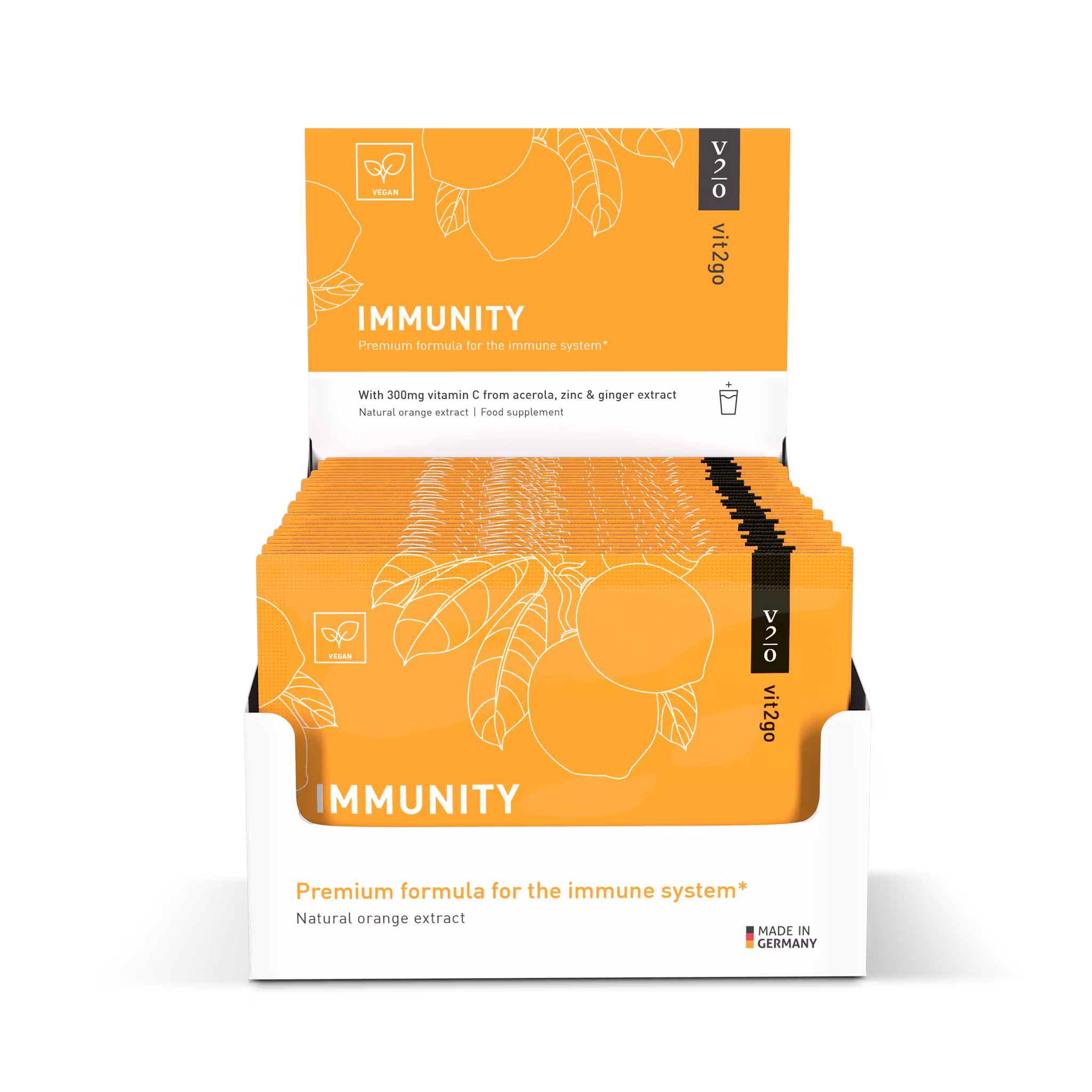 I en snabb och krävande vardag är det inte alltid lätt att få i sig alla nödvändiga näringsämnen. Vit2go IMMUNITY erbjuder en enkel och praktisk lösning. Kombinationen av högkvalitativa ingredienser stödjer kroppens eget immunförsvar och hjälper till att förebygga förkylningar, virus och influensaliknande infektioner.