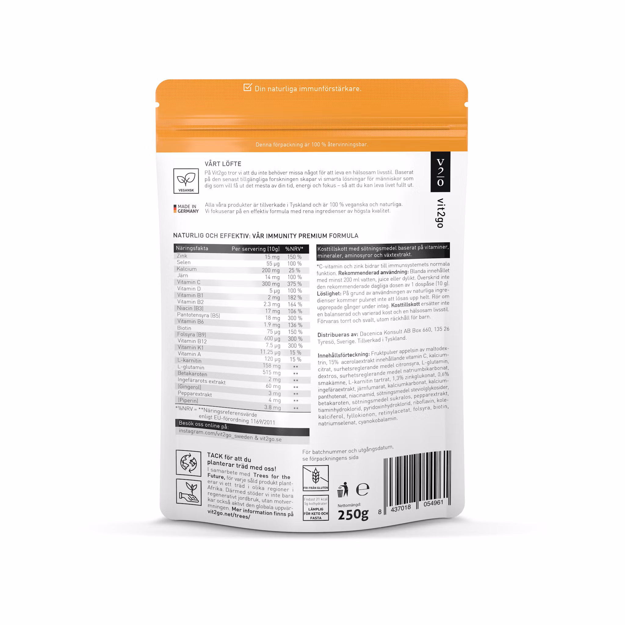 Orange fruktpulver av maltodextrin, 15% acerolaextrakt innehållande vitamin C, kalciumcitrat, surhetsreglerande medel citronsyra, L-glutamin, dextros, surhetsreglerande medel natriumbikarbonat, smakämne, L-karnitin tartrat, 1,3% zinkglukonat, 0,6% ingefäraextrakt, järnfumarat, kalciumkarbonat, kalciumpanthotenat, niacinamid, sötningsmedel steviolglykosider, betakaroten, sötningsmedel sukralos, pepparextrakt, tiaminhydroklorid, pyridoxinhydroklorid, riboflavin, kolekalciferol, fyllokionon, retinylacetat, folsyra, biotin, natriumselenat, cyanokobalamin