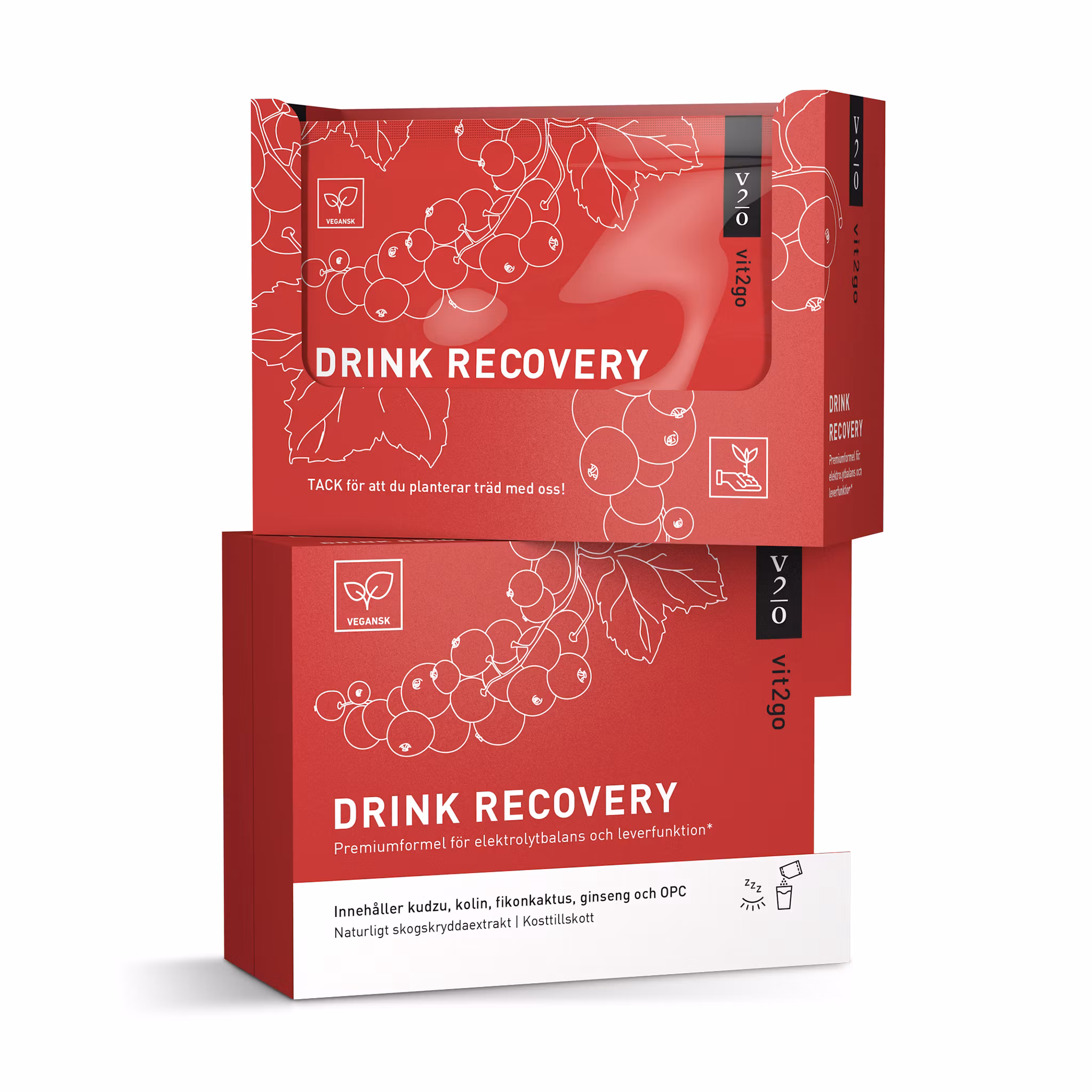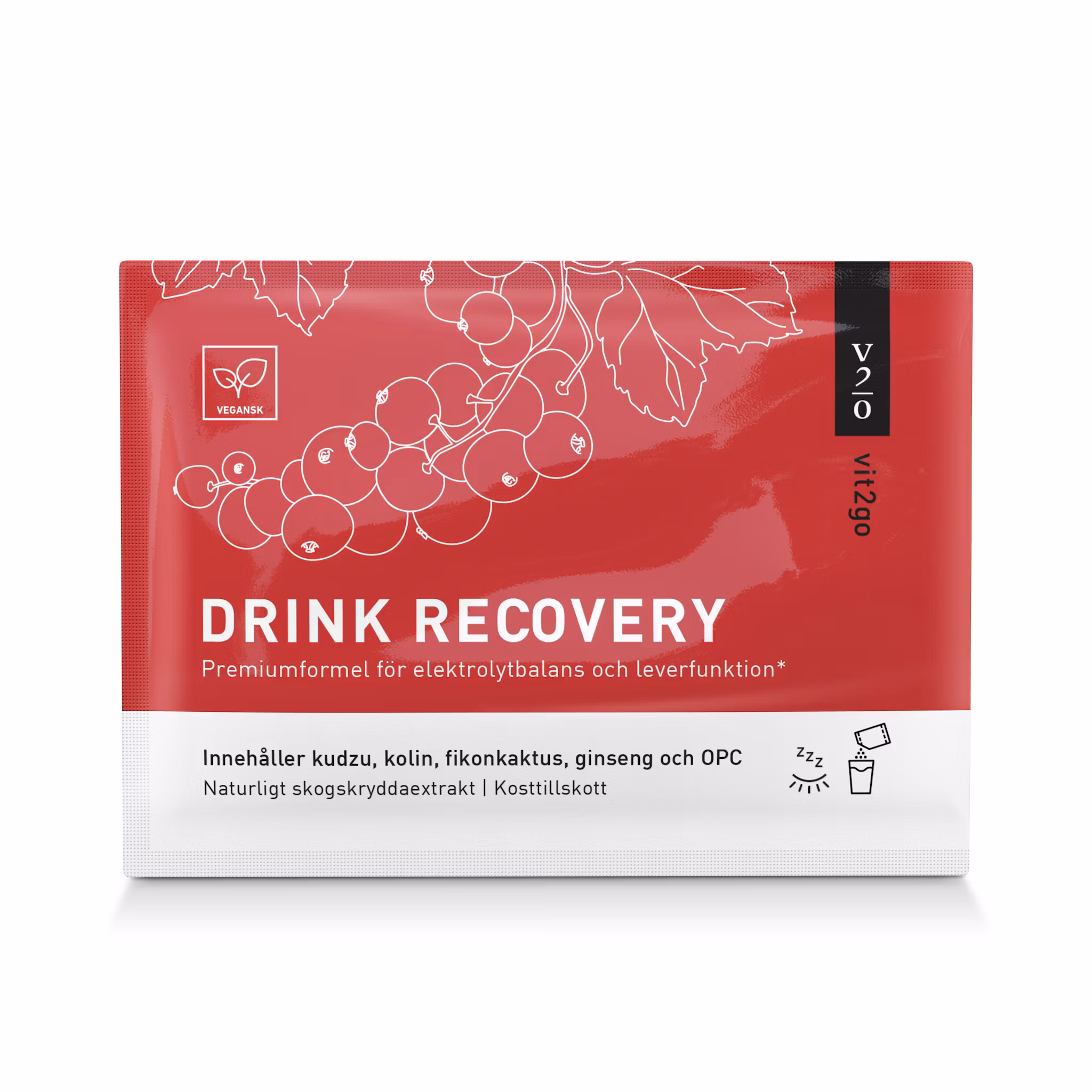 Kaliumcitrat, magnesiumcitrat, svartvinbärsfruktpulver på maltodextrin, kalciumcitrat, L-ornitinhydroklorid, surhetsreglerande medel citronsyra, dextros, surhetsreglerande medel natriumbikarbonat, L-karnitin tartrat, polyfenoliskt druvkärnextrakt, smakämne, 2,5% kudzublomextrakt, 2% kolinbitartrat, askorbinsyra, 1,25% mjölktistel extrakt, ginsengrotspulver, fikonkaktuspulver, zinkglukonat, 0,65% L-cysteinhydroklorid, kalcium pantotenat, niacinamid, sötningsmedel steviolglykosid, pyridoxinhydroklorid, sötningsmedel sukralos, tiaminhydroklorid, riboflavin, kolekalciferol, folsyra, cyanokobalamin